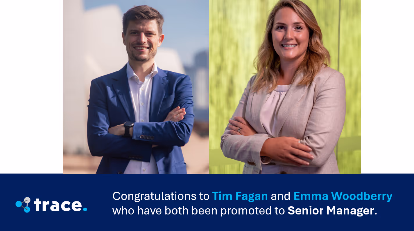 "Of all the great moments we’ve experienced in trace. so far, this one is extra special! We are incredibly excited and proud to announce our first promotions, with both Emma Woodberry and Tim Fagan being promoted to Senior Manager. From all of us at the trace. team, thank you Emma and Tim for your effort and dedication, and helping establish an inclusive, collegiate culture at trace.!" Mathew Tolley, Partner.